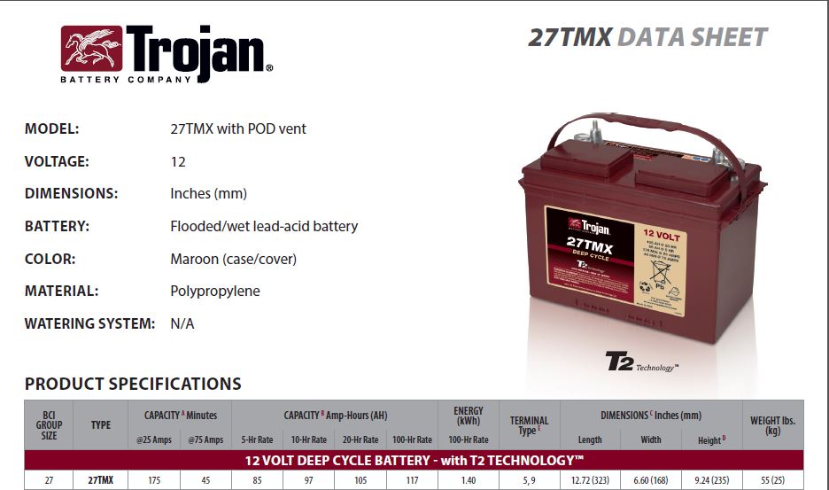 Trojan 27 TMX Deep Cycle Battery Free Delivery most locations in the lower 48*.