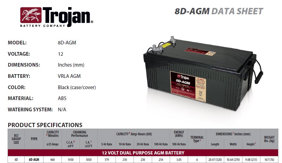 Trojan 8D-AGM 12 Volt Battery Free Delivery most locations in the lower 48.*
