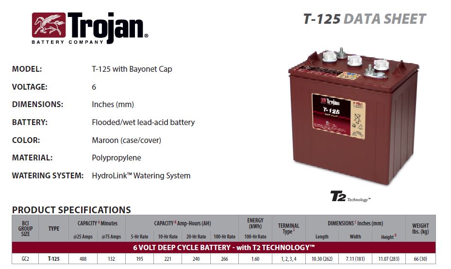 TROJAN T-125 6V Flooded Lead Acid Battery Golf Cart RV Marine  Duffy & ElectraCraft Electric Boat Battery